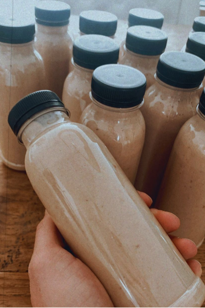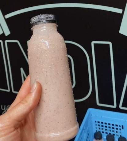 Ingrediënten: 22% banaan, 13% aardbei, 7% blauwe bes, magere yoghurt, sojadrink, havermout, proteïne poeder